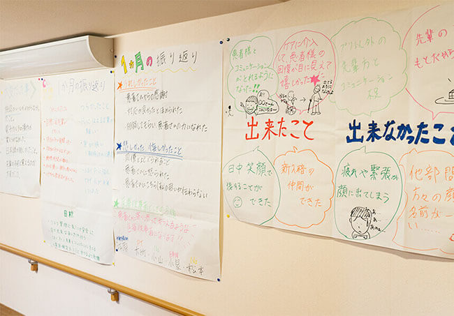 当院の新人研修は、看護部、リハビリ部、栄養科、放射線科、検査部などとの合同の座学研修から始まります。各職種から講師が出て仕事を説明し、新人同士も交流して互いの理解を深めます。看護の実務を経験した5月には、お菓子を食べながら楽しく1カ月を振り返るグループワーク。看護の現場で戸惑う新人たちも、グループの共同作業でそれまでの成果を発表することで、少し自信を取り戻してくれることでしょう。