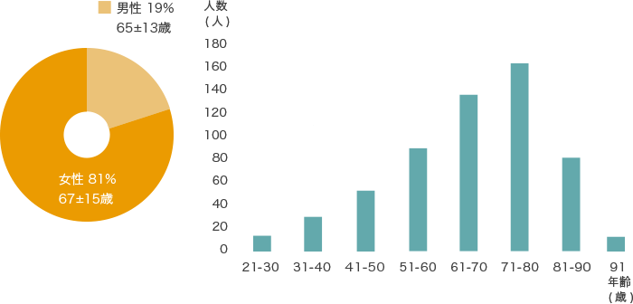 | 女 (人) | 9 | 18 | 36 | 60 | 110 | 131 | 65 | 9 | 438 |